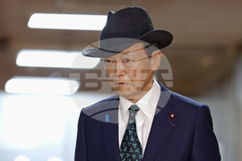 Former Prime Minister Taro Aso walks at the headquarters of the ruling Liberal Democratic Party, after meeting with newly-elected party leader Sanae Takaichi, on Oct. 5, 2025, in Tokyo. (Kyodo News via AP)