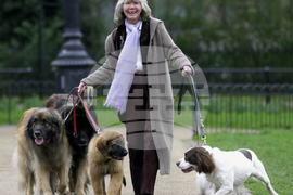 FILE - Author Jilly Cooper walks with an army of dogs and rare breeds at a photocall to launch Crufts Dog Show, in London, England, Feb. 20, 2002. (Stefan Rousseau/PA via AP, File)