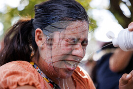 A protester is doused with milk, water, and saline after tear gas in the Brighton Park neighborhood of Chicago, on Saturday, Oct. 4, 2025, after protesters learned that U.S. Border Patrol shot a woman Saturday morning on Chicago's Southwest Side. (Anthony Vazquez/Chicago Sun-Times via AP)