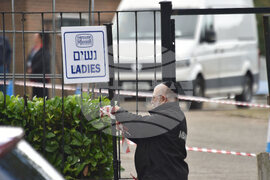 The service is held at the entrance to the Ohel at the funeral of Adrian Daulby at Agecroft Jewish Cemetery in Salford, Manchester, Monday Oct. 6, 2025. (Peter Powell/PA via AP)