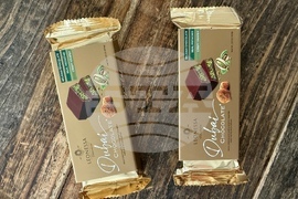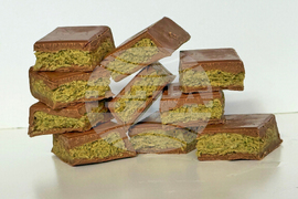 Pieces of Dubai chocolate by Chocolove are displayed in New York. (Katie Workman via AP)