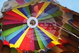 A colorful hot air balloon lands on the west bank of the Nile River in Luxor, Egypt, Oct. 4, 2025. (AP Photo/Amr Nabil)