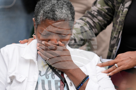 Lolita Griffeth, fiancé of Cornelius Taylor, cries during a rally at the Atlanta City Hall on Monday, Oct. 6, 2025, in Atlanta. Taylor, died after he was crushed by a bulldozer at a homeless encampment in January. (AP Photo/Brynn Anderson)