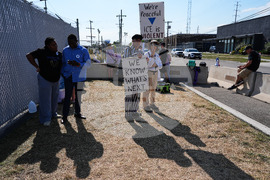 Protesters hold signs outside an ICE (U.S. Immigration and Customs Enforcement) processing facility in the Chicago suburb of Broadview, Ill., Monday, Oct. 6, 2025. (AP Photo/Nam Y. Huh)