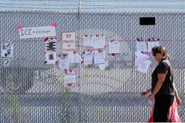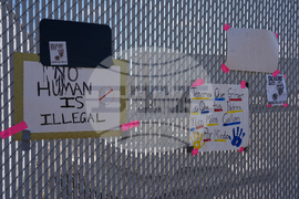 Protest signs hang on a fence outside an ICE (U.S. Immigration and Customs Enforcement) processing facility in the Chicago suburb of Broadview, Ill., Monday, Oct. 6, 2025. (AP Photo/Nam Y. Huh)
