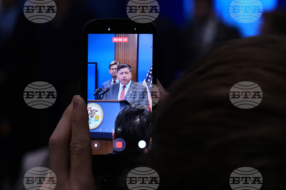 A person takes a video as Illinois Governor JB Pritzker speaks at a news conference in Chicago, Monday, Oct. 6, 2025. (AP Photo/Nam Y. Huh)