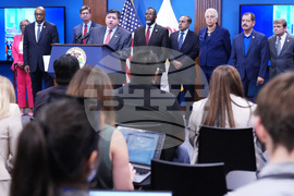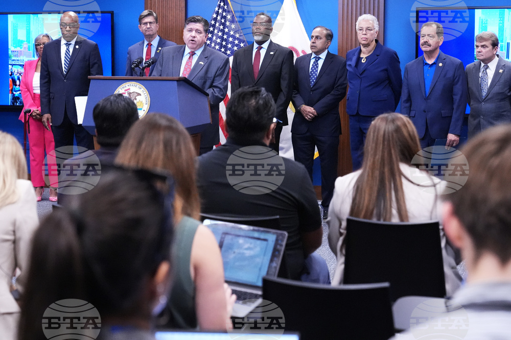 Governor JB Pritzker, second from right, speaks as Chicago Mayor Brandon Johnson, right, listens to him at a news conference in Chicago, Monday, Oct. 6, 2025. (AP Photo/Nam Y. Huh)