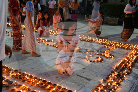 Buddhist devotees light oil lamps at Botataung pagoda during celebrations of the full moon day of Thadingyut, the end of Buddhist Lent, Monday, Oct. 6, 2025, in Yangon, Myanmar. (AP Photo/Thein Zaw)