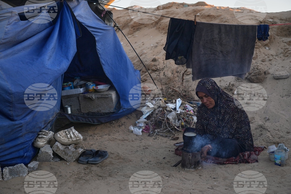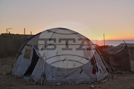 The sun sets behind a tent set up by a family near the beach after fleeing northern Gaza, at dusk in Nuseirat, central Gaza Strip, Tuesday, Oct. 7, 2025. (AP Photo/Abdel Kareem Hana)