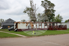 A home's exterior is damaged on June 25, 2025 following an EF5 tornado in Enderlin, N.D. (North Dakota Governor's Office via AP)