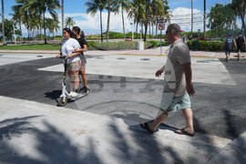 Pedestrians walk over a crosswalk on Miami Beach's iconic Ocean Drive that used to be rainbow-colored celebrating the history and contributions of the LGBTQ+ community, Monday, Oct. 6, 2025. (AP Photo/Marta Lavandier)