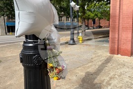 Star-shaped balloons and flowers were tied to street lights in downtown Montgomery, Ala., on Oct. 6, 2025 at the site of a mass shooting that killed two people and wounded a dozen others. (Kim Chandler/Associated Press)