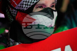 A Malaysian muslim women wears a face mask with Palestinian flags during a rally to celebrate Malaysian Global Sumud Flotilla activists at an indoor stadium in Kuala Lumpur, Malaysia, Wednesday, Oct. 8, 2025. (AP Photo/Vincent Thian)