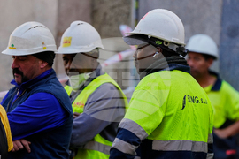 Workers wait near the site of a building collapse in Madrid, Spain, Tuesday, Oct. 7, 2025. (AP Photo/Manu Fernandez)