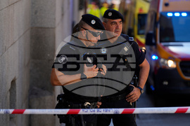 Police rope off an area of a building collapse in Madrid, Spain, Tuesday, Oct. 7, 2025. (AP Photo/Manu Fernandez)