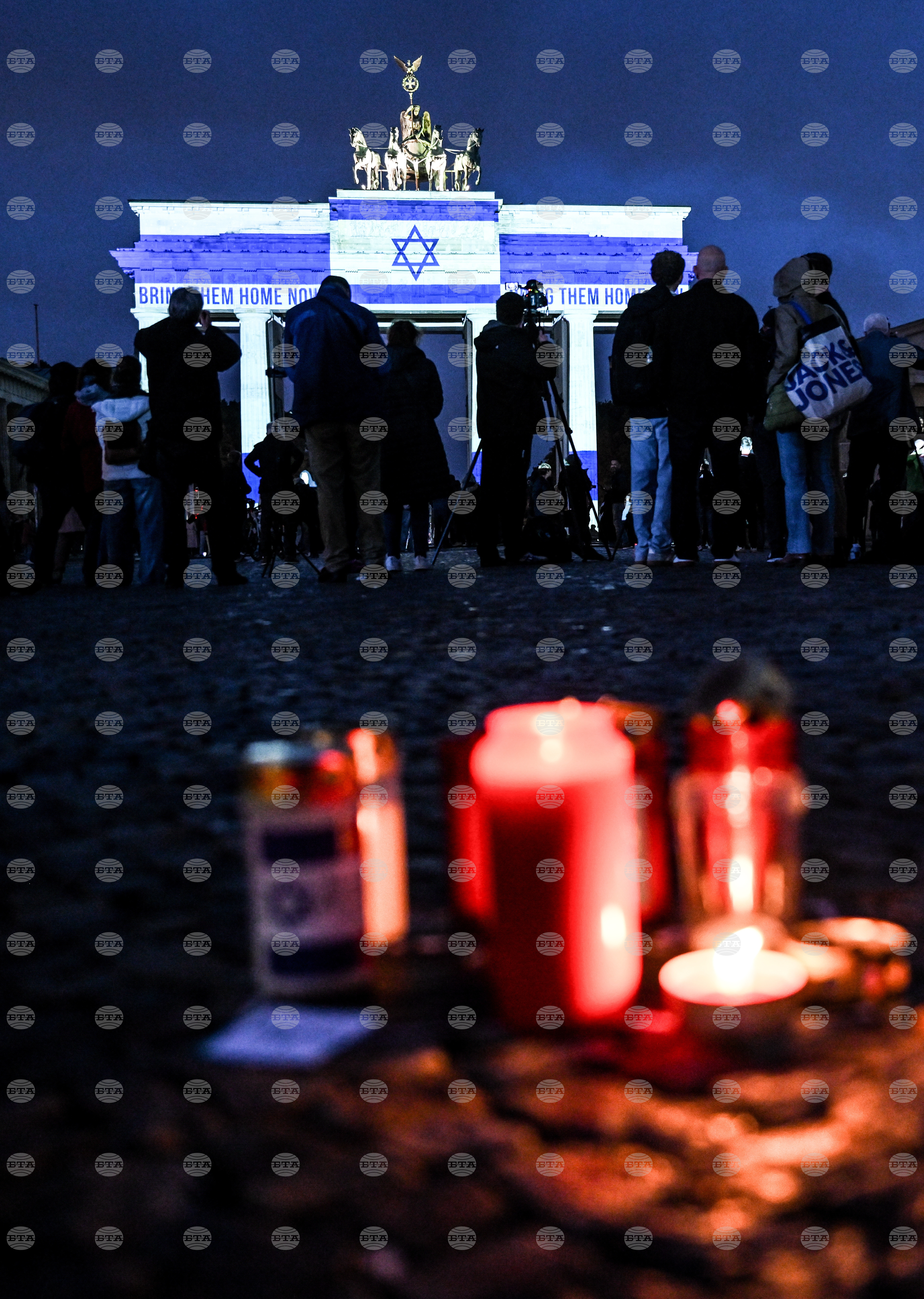 The Brandenburg Gate is illuminated with the slogan "Bring them back home now", in Berlin, Tuesday, Oct. 7, 2023. (Britta Pedersen/dpa via AP)