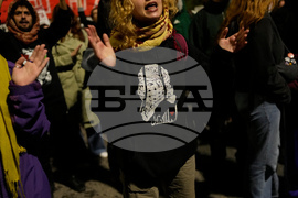 Protesters chant pro-Palestinian slogans outside the Israeli Embassy in Athens, Tuesday, Oct. 7, 2025, marking the two-year anniversary of Hamas' attack on Israel. (AP Photo/Petros Giannakouris)