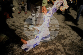 Protesters burn an Israeli flag during a pro-Palestinian demonstration outside the embassy of Israel in Athens, Tuesday, Oct. 7, 2025, marking the two-year anniversary of Hamas' attack on Israel. (AP Photo/Petros Giannakouris)