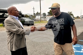 Orleans Parish Clerk of Court Candidate Calvin Duncan, left, shakes hands with Raymond Flanks Sept. 25, 2025 in New Orleans. Flanks was released from prison in 2022 after a judge vacated Flanks' conviction in a 1983 murder ending his nearly four decades in prison. (AP Photo/Stephen Smith)