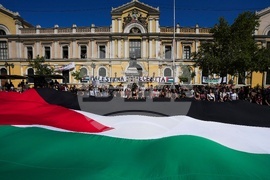 University students demonstrate in support of the Palestinians and against Israel's war in Gaza, in front of the Universidad de Chile building in Santiago, Chile, Tuesday, Oct. 7, 2025. (AP Photo/Esteban Felix)