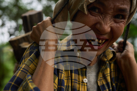 A woman smokes tobacco after returning from foraging for food outside their refugee camp in the Tak province of Thailand, Tuesday, Aug. 26, 2025. (AP Photo/Bram Janssen)