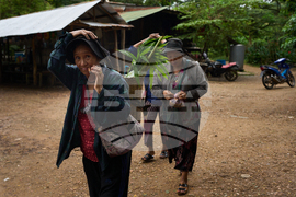A woman carries logs she foraged in a forest near the Mae La refugee camp in the Tak province of Thailand, Thursday, Aug. 28, 2025. (AP Photo/Bram Janssen)