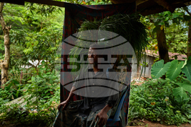 Mahmud Karmar poses for a portrait with a basket of grass he spent the morning gathering to feed his family's cow in the Tak province of Thailand, Thursday, Aug. 28, 2025. (AP Photo/Bram Janssen)