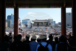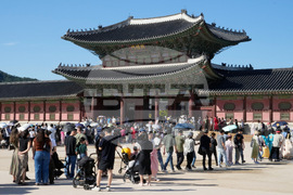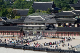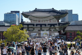 People wait in line to enter the Gyeongbok Palace as they visit to celebrate Chuseok holidays, the Korean version of Thanksgiving Day, in Seoul, South Korea, Wednesday, Oct. 8, 2025. (AP Photo/Ahn Young-joon)