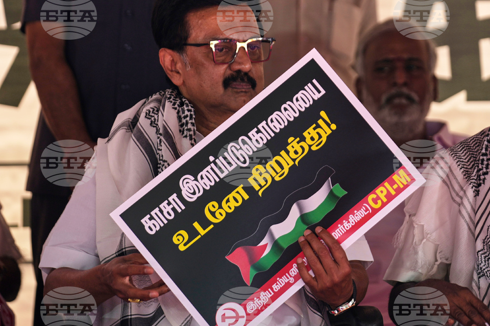 Tamil Nadu Chief Minister M. K. Stalin holds a banner in Tamil that reads, "Stop the killing in Gaza", during a demonstration in Chennai, India in support of the Palestinians and against Israel's war in Gaza, Wednesday, Oct. 8, 2025. (AP Photo/Mahesh Kumar A.)