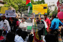 Protesters gather for a demonstration in Chennai, India in support of the Palestinians and against Israel's war in Gaza, Wednesday, Oct. 8, 2025. (AP Photo/Mahesh Kumar A.)