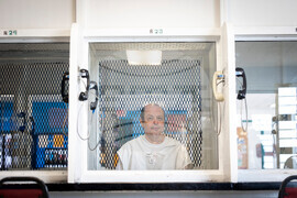 Robert Roberson waits to be interviewed in a locked visitation cell at the Allan B. Polunsky Unit prison in Livingston, Texas, Wednesday, Oct. 1, 2025. Roberson, who has maintained his innocence on death row for more than 20 years, is scheduled to be executed on Oct. 16, for the 2002 killing of his 2-year-old daughter, Nikki Curtis. (AP Photo/Annie Mulligan)