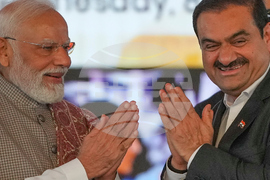 Indian Prime Minister Narendra Modi, left, greets Chairman Adani Group, Gautam Adani during the inauguration ceremony of the Navi Mumbai International Airport in Navi Mumbai, India, Wednesday, Oct. 8, 2025. (AP Photo/Rafiq Maqbool)