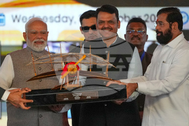 Maharashtra Deputy Chief Minister Eknath Shinde, right, and Maharashtra Chief Minister Devendra Fadnavis, centre, present a replica of a vintage plane to Indian Prime Minister Narendra Modi, left, during the inauguration ceremony of the Navi Mumbai International Airport in Navi Mumbai, India, Wednesday, Oct. 8, 2025. (AP Photo/Rafiq Maqbool)