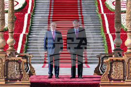 Russian President Vladimir Putin, background left, and Tajik President Emomali Rahmon, background right, attend an official welcome ceremony at the Palace of the Nation in Dushanbe, Tajikistan, on Thursday, Oct. 9, 2025. (Grigory Sysoyev, Sputnik, Kremlin Pool Photo via AP)