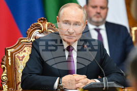 Russian President Vladimir Putin, background center, attends the Russian Tajikistan's talks with Tajik President Emomali Rahmon, third from right back to a camera, at the Palace of the Nation in Dushanbe, Tajikistan, on Thursday, Oct. 9, 2025. (Grigory Sysoyev, Sputnik, Kremlin Pool Photo via AP)