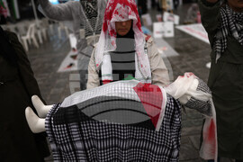 A woman holds a mannequin depicting a dead Palestinian child during a gathering in support of Palestinians, in Istanbul, Turkey, Tuesday, Oct. 7, 2025. (AP Photo/Francisco Seco)