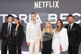 Cruz Beckham, from left, Jackie Apostel, Romeo Beckham, Harper Beckham, Victoria Beckham and David Beckham pose for photographers upon arrival at the premiere of the television series "Victoria Beckham" in London, Wednesday, Oct. 8, 2025. (Photo by Scott A Garfitt/Invision/AP)