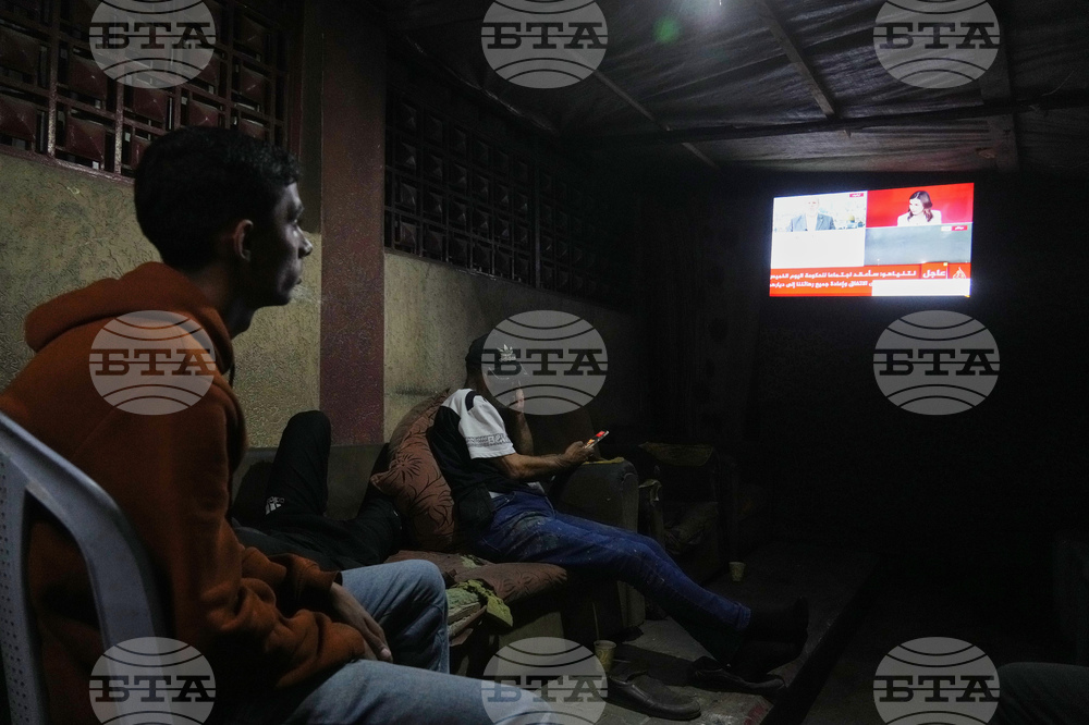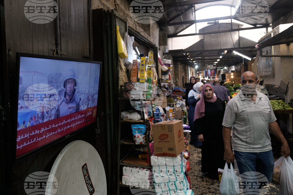 A street vendor watches the news on television after the announcement that Israel and Hamas have agreed to the first phase of a peace plan to pause the fighting, as he sits in his shop, Old City of Nablus, in the West Bank, Thursday, Oct. 9, 2025. (AP Photo/Majdi Mohammed)