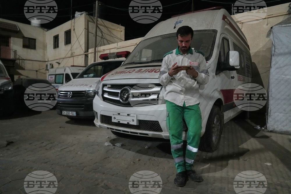 Palestinian paramedic Saeed Awad follows the news on his phone after the announcement that Israel and Hamas have agreed to the first phase of a peace plan to pause fighting, as he stands at Al-Aqsa Hospital, in Deir al-Balah, in the central Gaza Strip, Thursday, Oct. 9, 2025. (AP Photo/Abdel Kareem Hana)