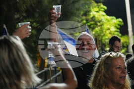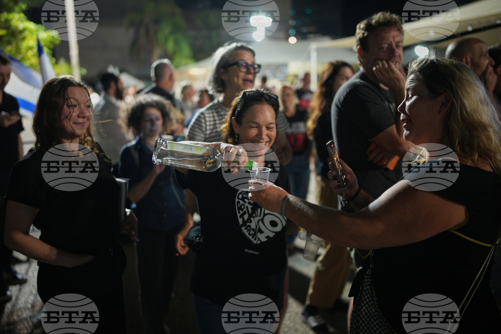 People celebrate following the announcement that Israel and Hamas have agreed to the first phase of a peace plan to pause the fighting, at a plaza known as hostages square in Tel Aviv, Israel, Thursday, Oct. 9, 2025. (AP Photo/Emilio Morenatti)