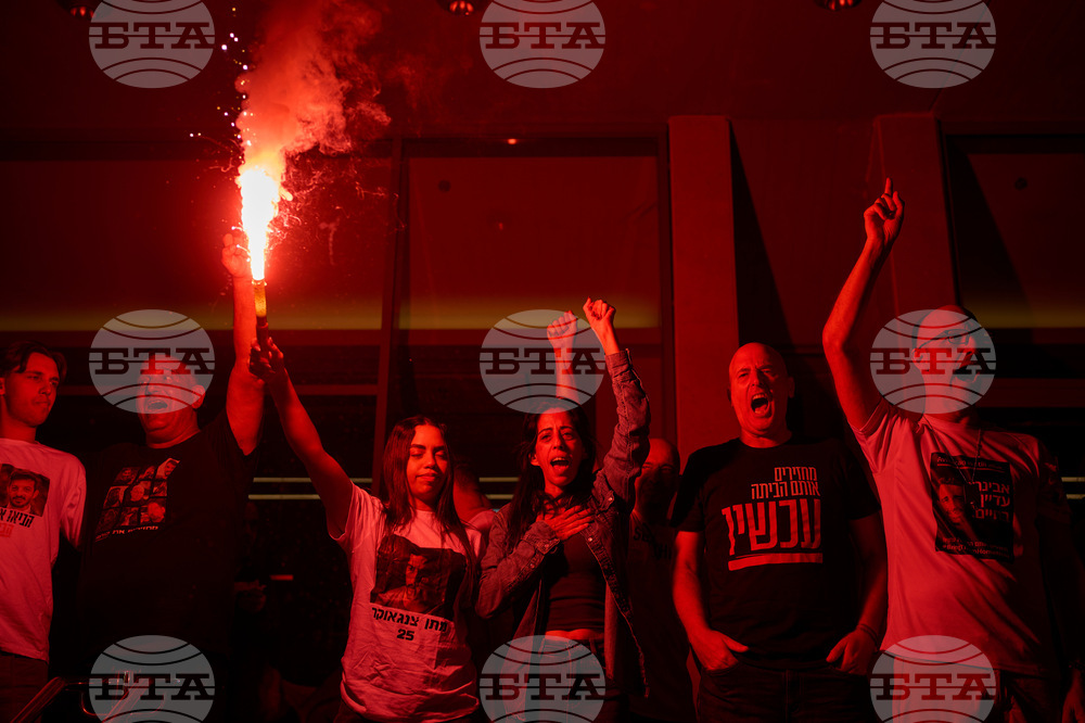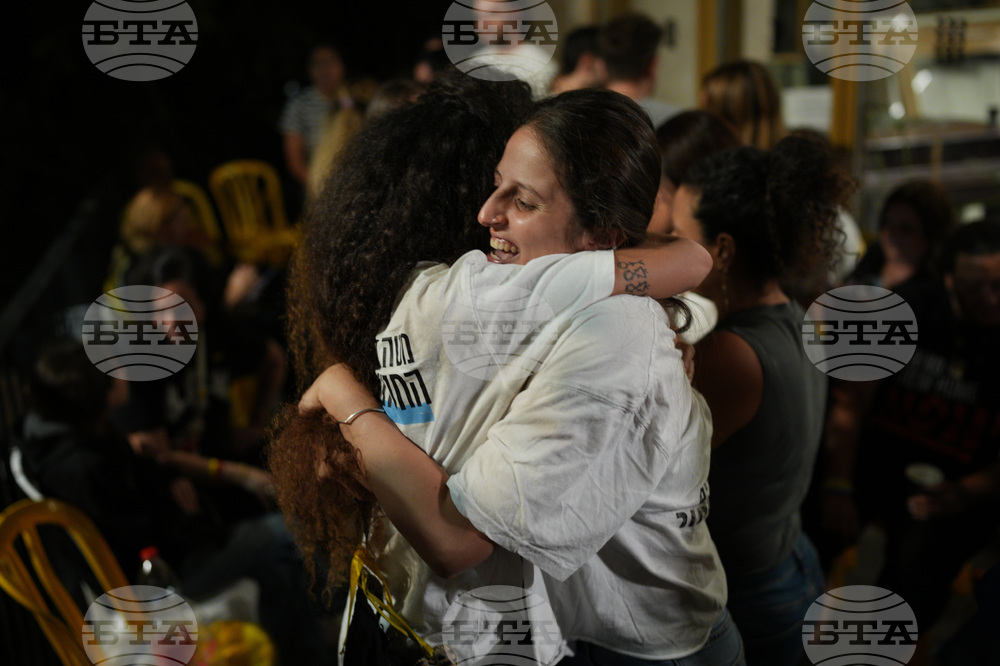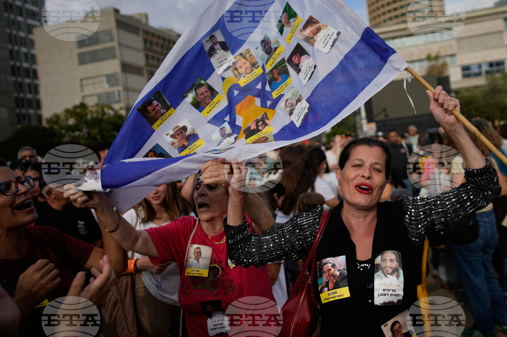 Relatives and supporters of Israeli hostages held by Hamas in the Gaza Strip celebrate after the announcement that Israel and Hamas have agreed to the first phase of a peace plan, as they gather at a plaza known as the hostages square in Tel Aviv, Israel, Thursday, Oct. 9, 2025. (AP Photo/Emilio Morenatti)