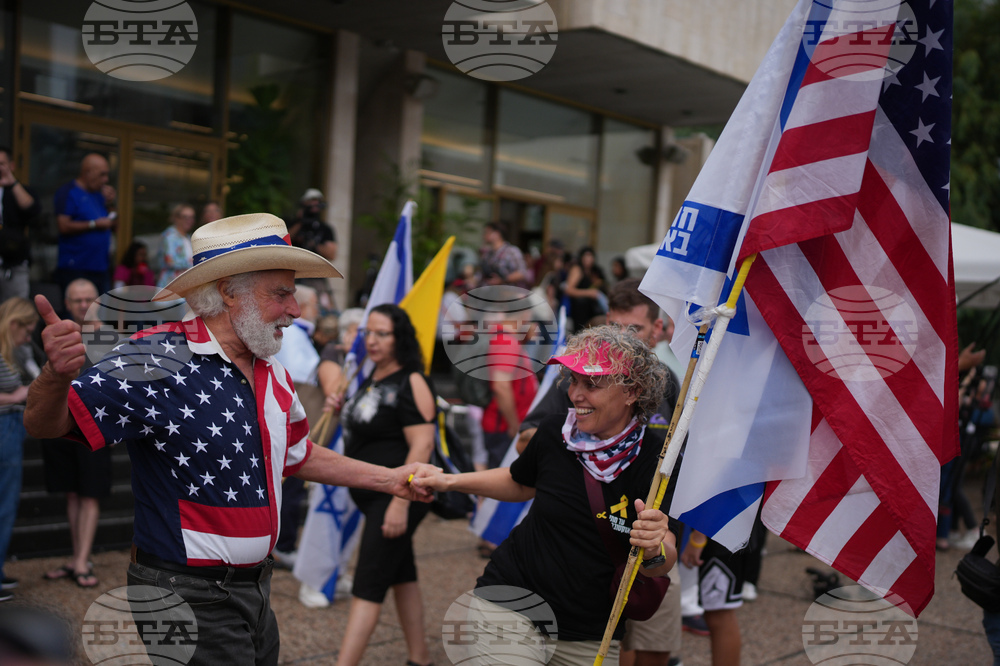 Einav Zangauker, right, mother of Matan Zangauker, who is being held hostage by Hamas, celebrates with others after the announcement that Israel and Hamas have agreed to the first phase of a peace plan to pause the fighting, in Tel Aviv, Israel, Thursday, Oct. 9, 2025. (AP Photo/Ohad Zwigenberg)