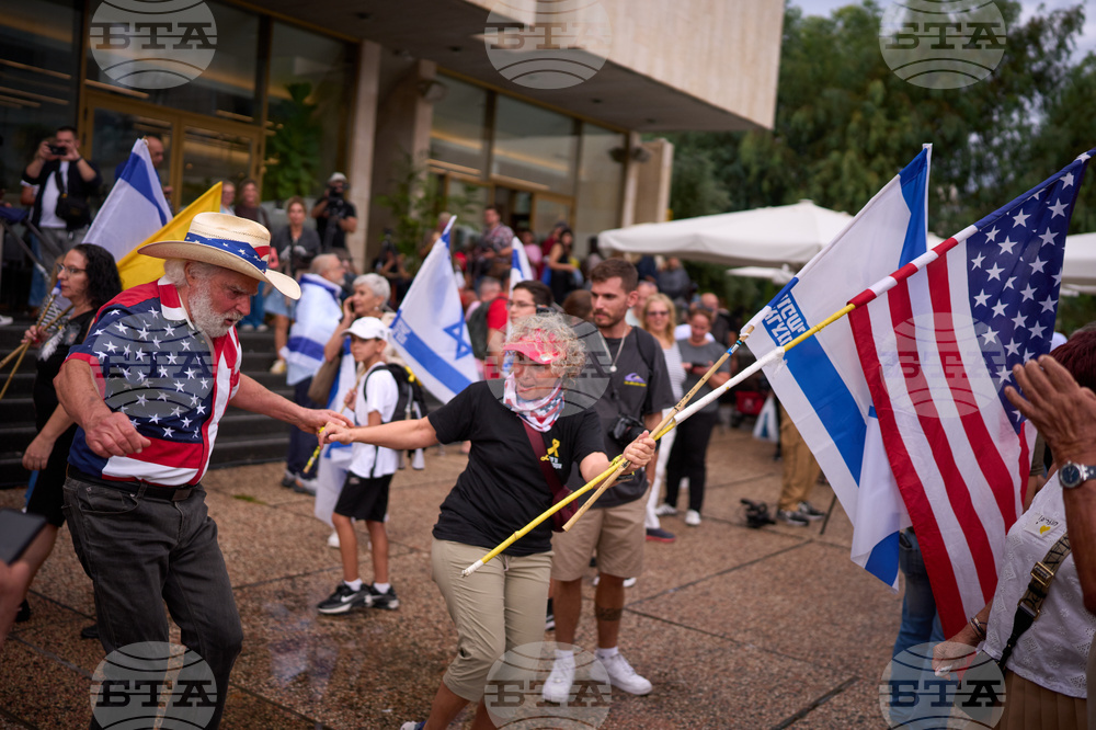 People dance as they celebrate following the announcement that Israel and Hamas have agreed to the first phase of a peace plan to pause the fighting, at a plaza known as hostages square in Tel Aviv, Israel, Thursday, Oct. 9, 2025. (AP Photo/Emilio Morenatti)