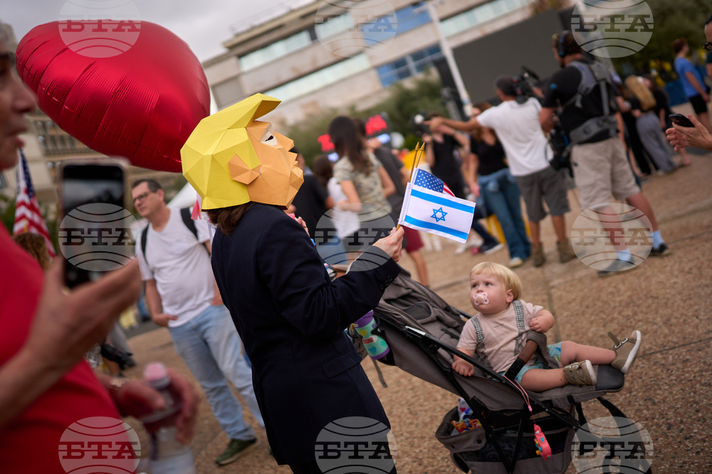 A person wears a mask depicting U.S. President Donald Trump as relatives and supporters of Israeli hostages held by Hamas in the Gaza Strip celebrate following the announcement that Israel and Hamas have agreed to the first phase of a peace plan to pause the fighting, as they gather at a plaza known as hostages square in Tel Aviv, Israel, Thursday, Oct. 9, 2025. (AP Photo/Emilio Morenatti)