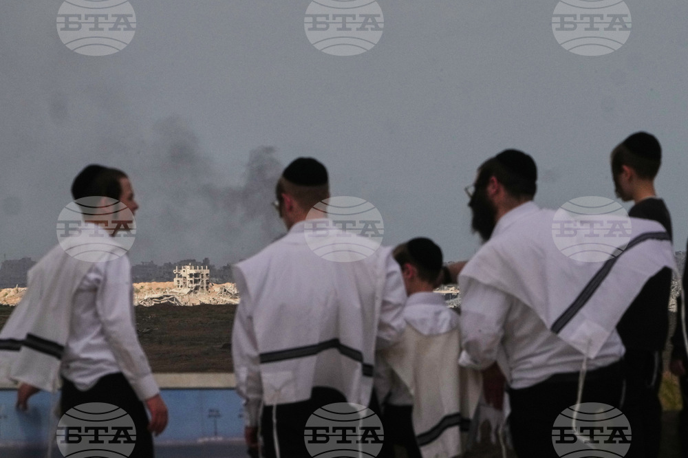 Jewish men observe smoke rising to the sky after an explosion in the Gaza Strip, as seen from southern Israel, Thursday, Oct. 9, 2025, following the announcement that Israel and Hamas have agreed to the first phase of a peace plan to pause the fighting. (AP Photo/Ariel Schalit)