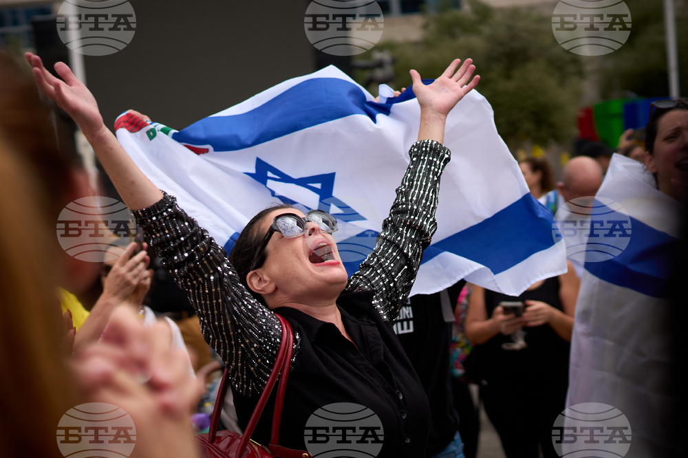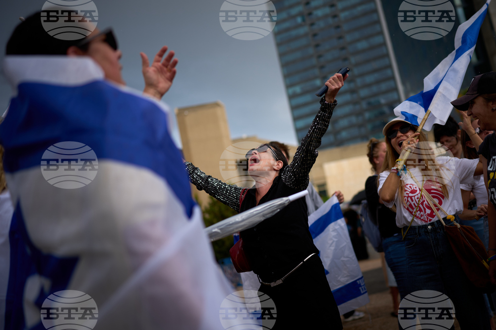 People react as they celebrate following the announcement that Israel and Hamas have agreed to the first phase of a peace plan to pause the fighting, at a plaza known as hostages square in Tel Aviv, Israel, Thursday, Oct. 9, 2025. (AP Photo/Emilio Morenatti)