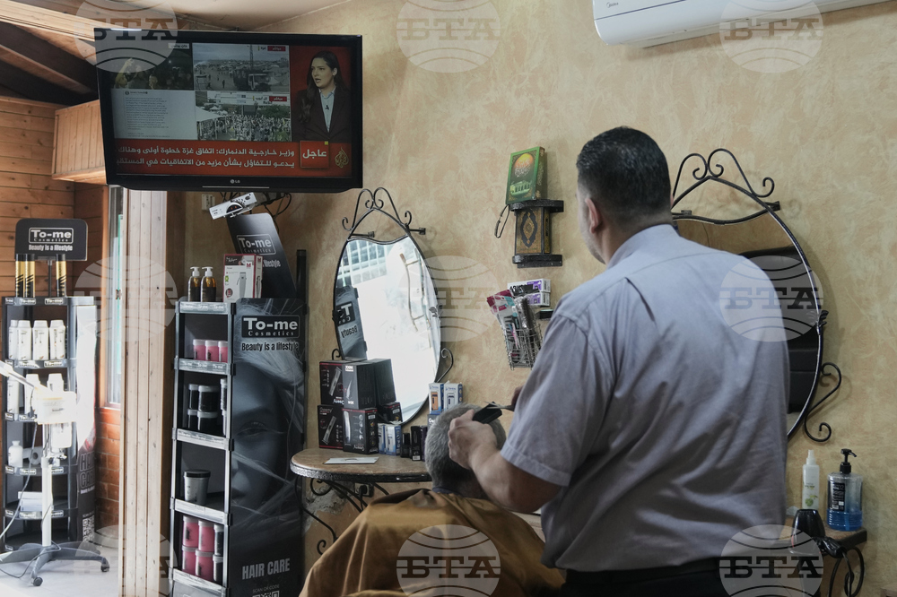 A barber cuts the hair of a customer as they watch the news on television following the announcement that Israel and Hamas have agreed to the first phase of a peace plan to pause the fighting, in Jerusalem, Thursday, Oct. 9, 2025. (AP Photo/Mahmoud Illean)