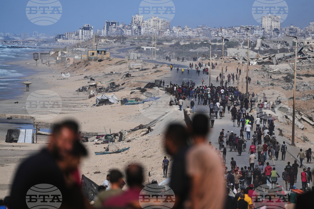 Displaced Palestinians gather on the coastal road near Wadi Gaza in the central Gaza Strip, Thursday, Oct. 9, 2025, during an attempt to return to Gaza City after the announcement that Israel and Hamas had agreed to the first phase of a peace plan to pause the fighting. (AP Photo/Abdel Kareem Hana)
