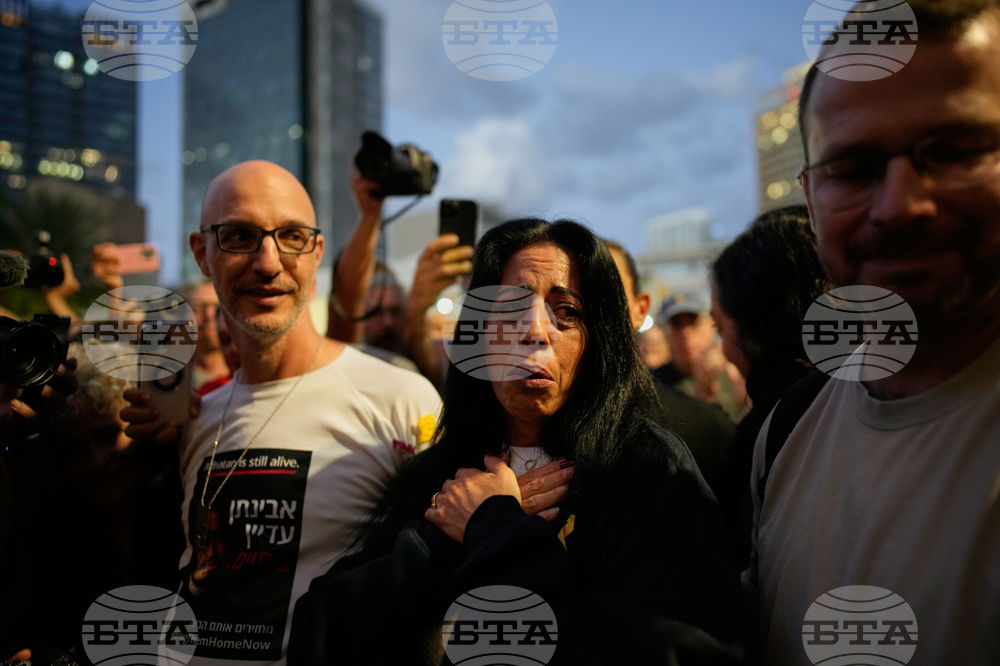 Einav Zangauker, center, mother of Matan Zangauker, who is being held hostage by Hamas, reacts along with other families and supporters of Israeli hostages after the announcement that Israel and Hamas have agreed to the first phase of a peace plan, as they gather at a plaza known as the hostages square in Tel Aviv, Israel, Thursday, Oct. 9, 2025. (AP Photo/Ohad Zwigenberg)