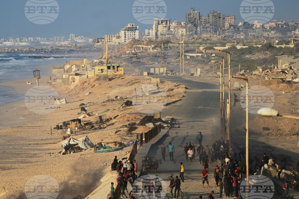 Israeli tanks are positioned on the coastal road leading to Gaza City as displaced Palestinians gather near Wadi Gaza in the central Gaza Strip, Thursday, Oct. 9, 2025. (AP Photo/Abdel Kareem Hana)